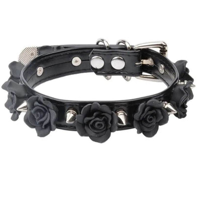 Known as the Floral Spikes Collar or Rose Flower Choker, this collar is 100% handmade, ensuring a high-quality product. The intricate design features a black rose motif, adding a touch of elegance to the overall aesthetic.