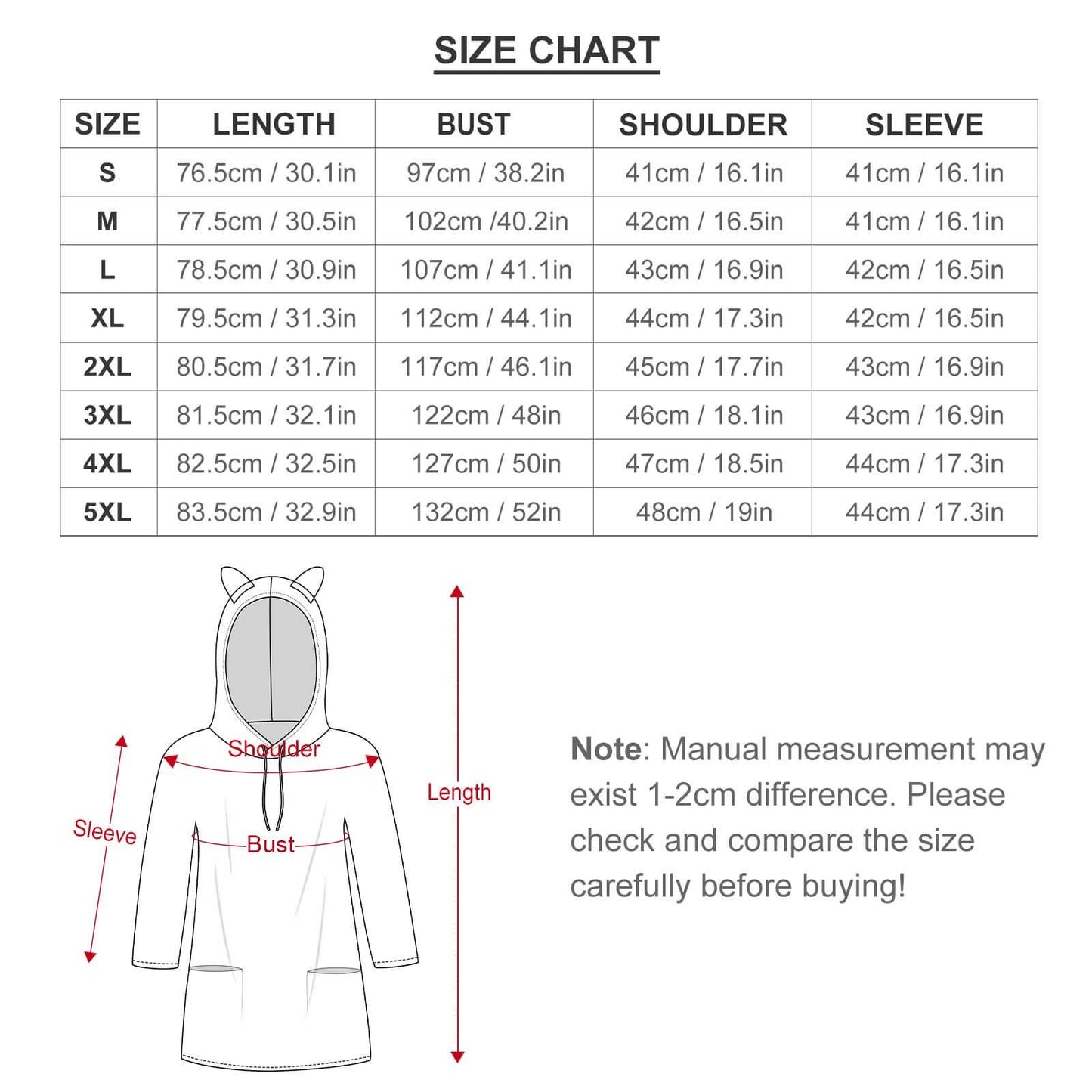 - Sizes: S, M, L, XL, 2XL, 3XL, 4XL, 5XL. Calculate your size from the measurement chart below please.